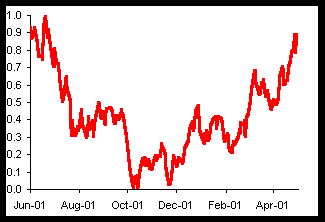 To read the chart, just follow the chart and remember that 1.0 is the contract high for the 11 months displayed, and 0.0 is the contract low.